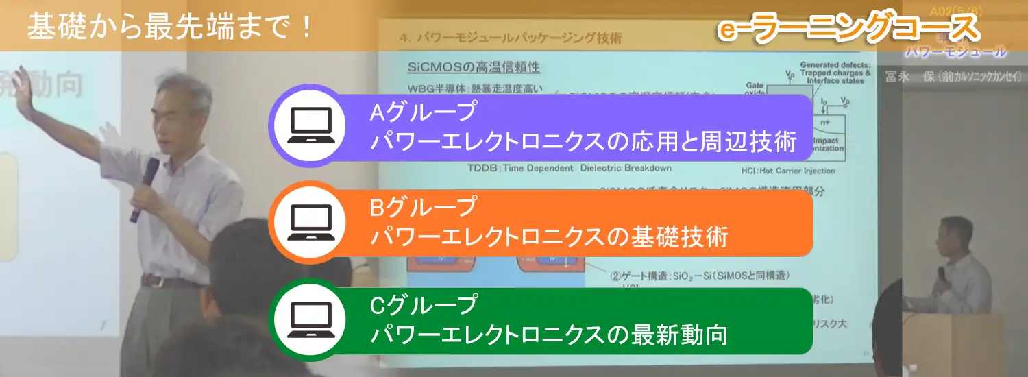 パワーエレクトニクス技術全体を俯瞰し、新たな発想に基づき今後の技術開発を牽引していく人材を継続的に育成することを目指します。NEDOの委託事業の後続版として、e-ラーニングコースおよび体験で身に着けるベーシックコース、及びe-ラーニングに関連す