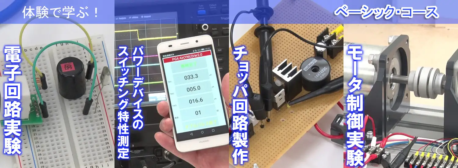 何時でも何処でも学べる「e-ラーニング」講座でパワーエレクトロニクスの基礎から先端周辺技術を学びます。また理解を更に深める為にオプションとして製造プロセスの見学も用意しました。 | 4種類の実験を通して、パワーエレクトロニクスを体感して学ぶことを目指します。それぞれ用意された教材をこなすことにより、実験内容をより深く習得することができます。 |